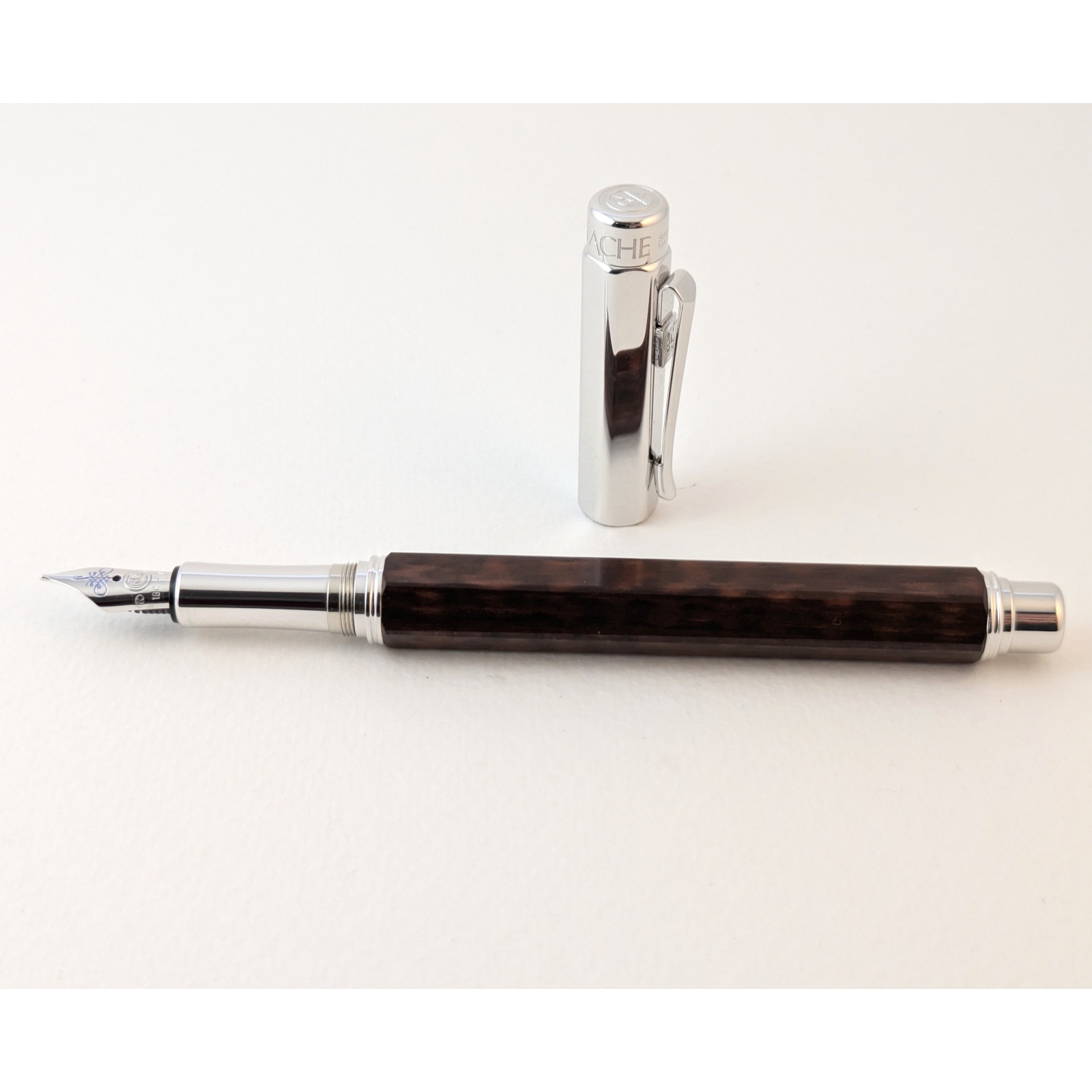 The Varius Snakewood fountain pen, no longer in production. The barrel made from Snakewood has a very fine grain coming from a rare tropical species the Brosnum tree, found in Guyana and Surinam, has a tiger red-brown appearance that resembles a snake and gives it its English name, Snakewood.