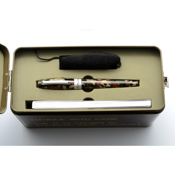 Based on the Fortuna model the Camouflage fountain pen is made from earth-tone camouflage patterned resin following genuine military design criteria, with brushed bronze-plated trim. For those who insist, however, on military precision, the technical term for the colour is “IP dark brown".